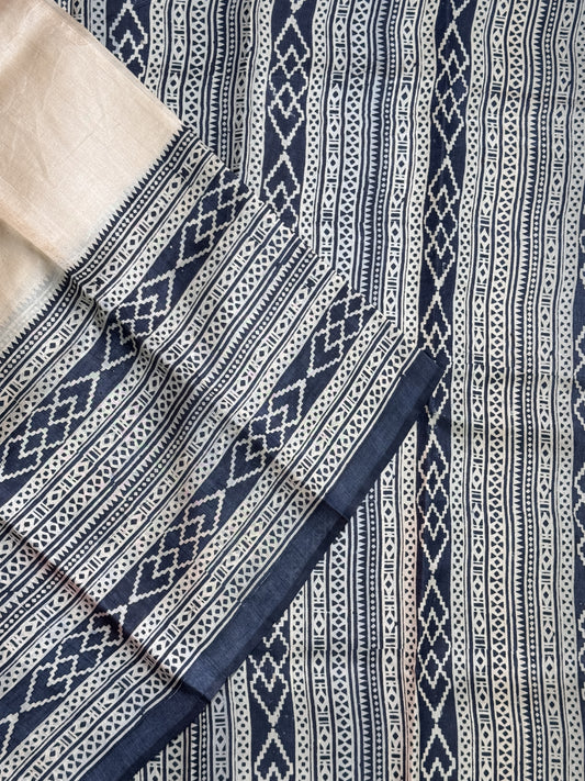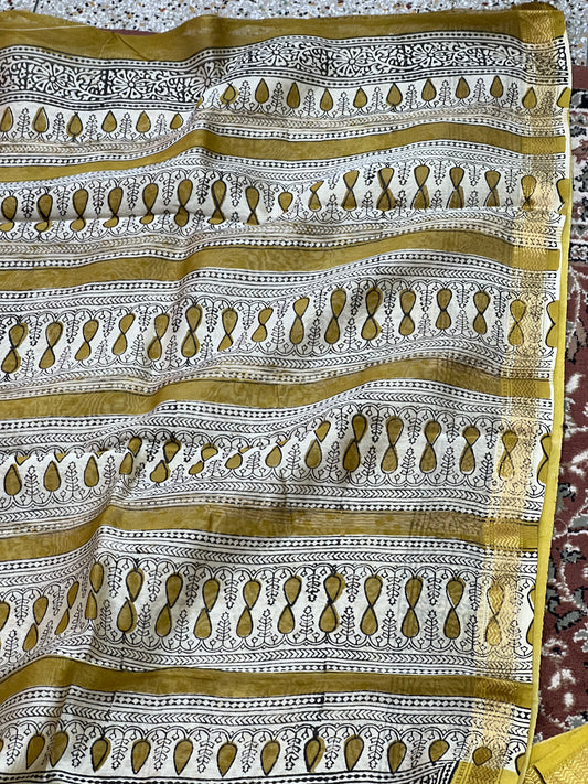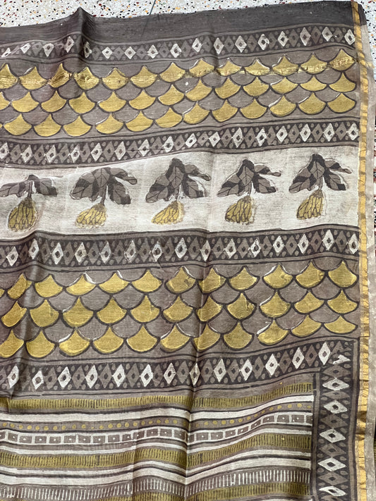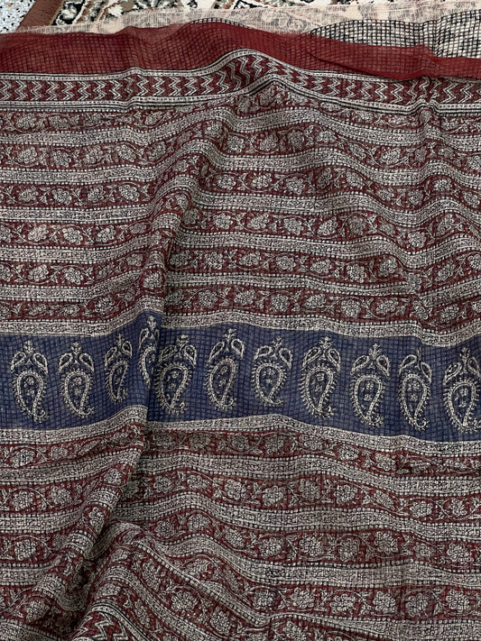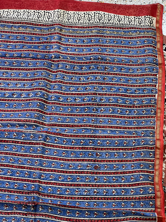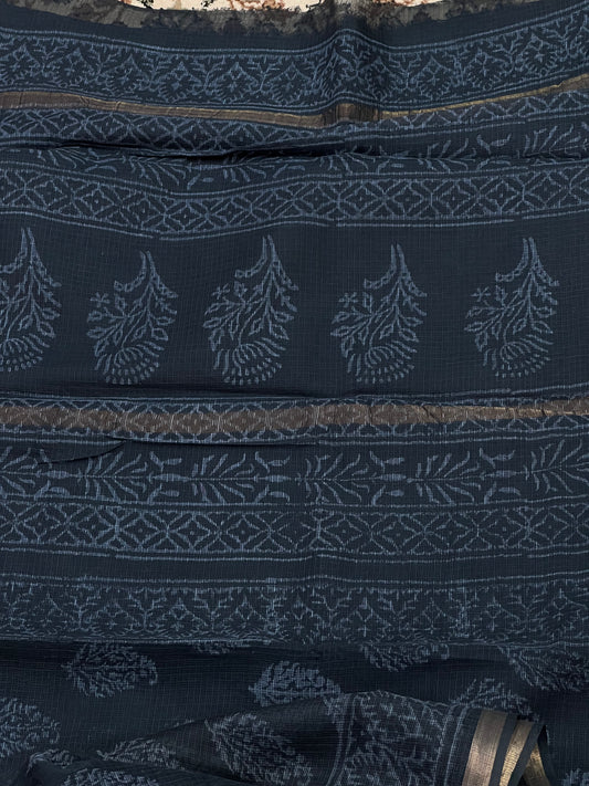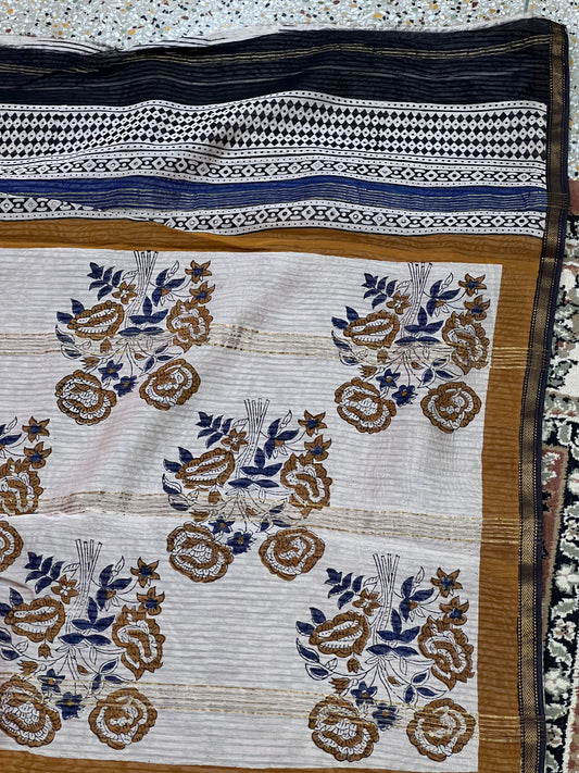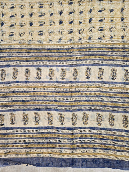 BEIGE BLUE HANDBLOCK KOTA DORIYA SAREE