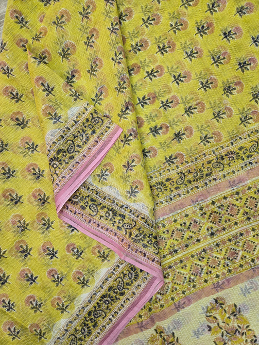 Sold outYELLOW HANDBLOCK KOTA DORIYA SAREE