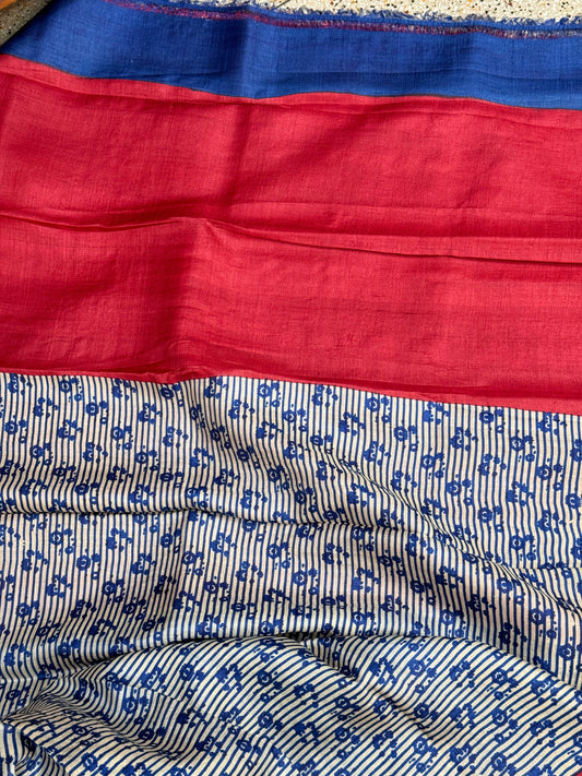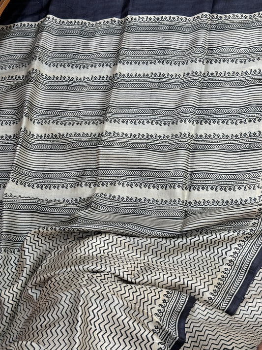 White Blue Handblock Printed Tussar Silk Saree