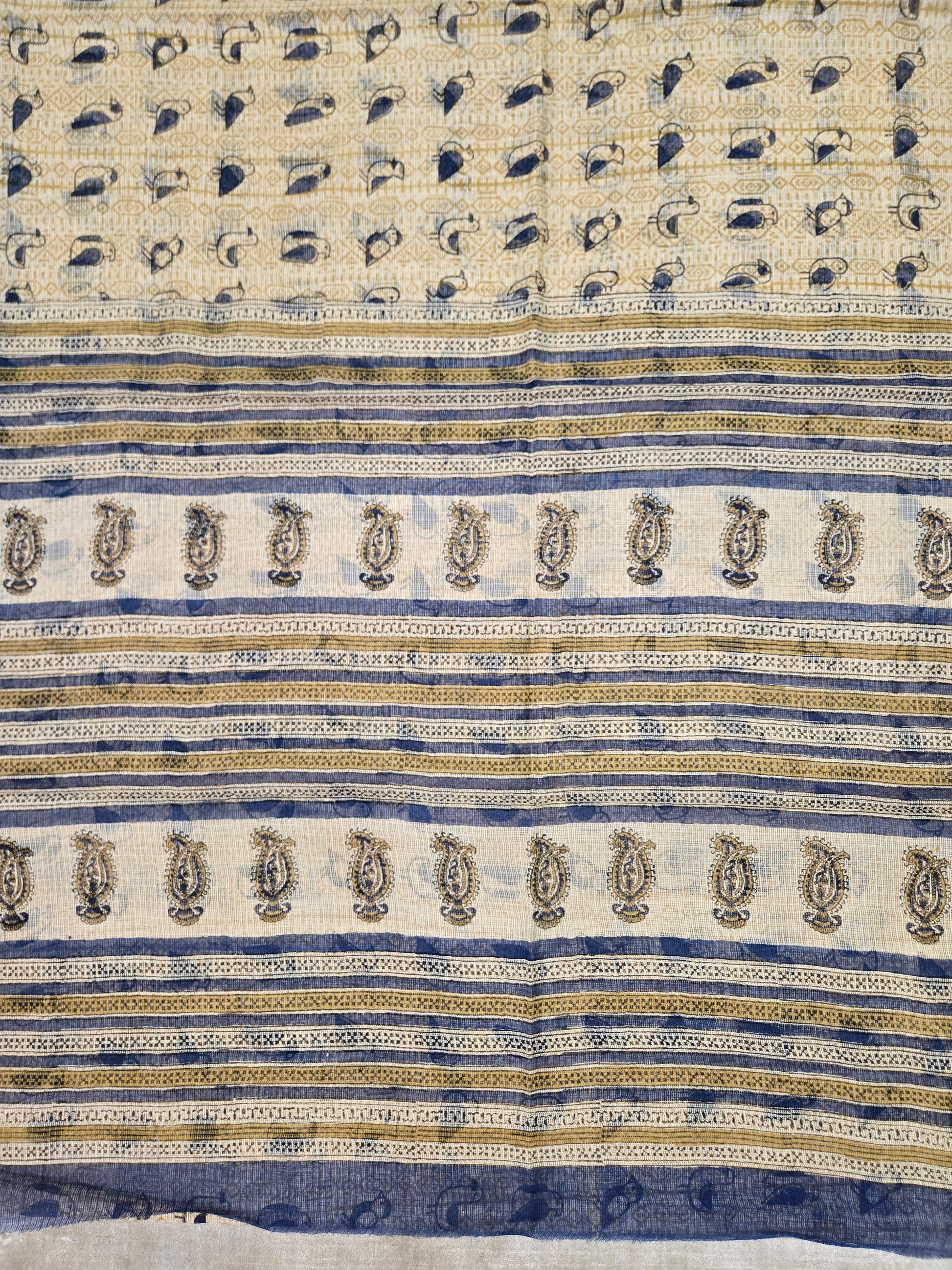BEIGE BLUE HANDBLOCK KOTA DORIYA SAREE